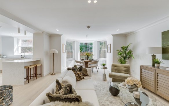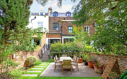 A superbly presented three double bedroom apartment (1,569 sq ft / 146 sqm) with its own private garden, set within an impressive white stucco fronted period building on one of Belsize Park’s most desirable tree lined roads.