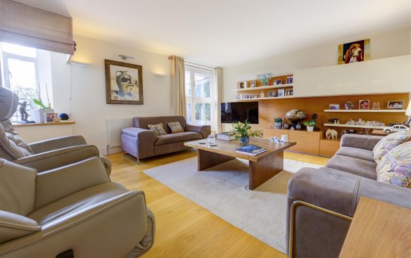 The wonderful lateral accommodation provides particularly generous living and entertaining space, including a 25’3 x 16′ reception room with access to a large terrace, a separate dining area measuring 16’5 x 13’9 and a beautifully appointed kitchen featuring a built in breakfast area.