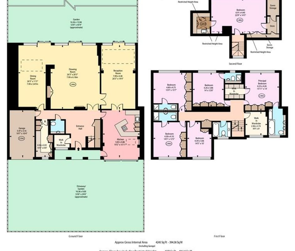 The first floor features a principal bedroom suite with ensuite bathroom and walk-in wardrobe, three additional double bedrooms each with ensuite bathrooms, and a fifth bedroom served by a separate bathroom. The second floor provides a 22'8" bedroom with eaves storage — ideal for guests, a study, or a playroom.