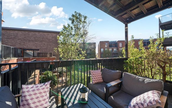 A particularly appealing feature of the apartment is the open-plan kitchen/dining/reception room, which provides direct and seamless access to private outdoor amenity on the quiet rear side of the block.
