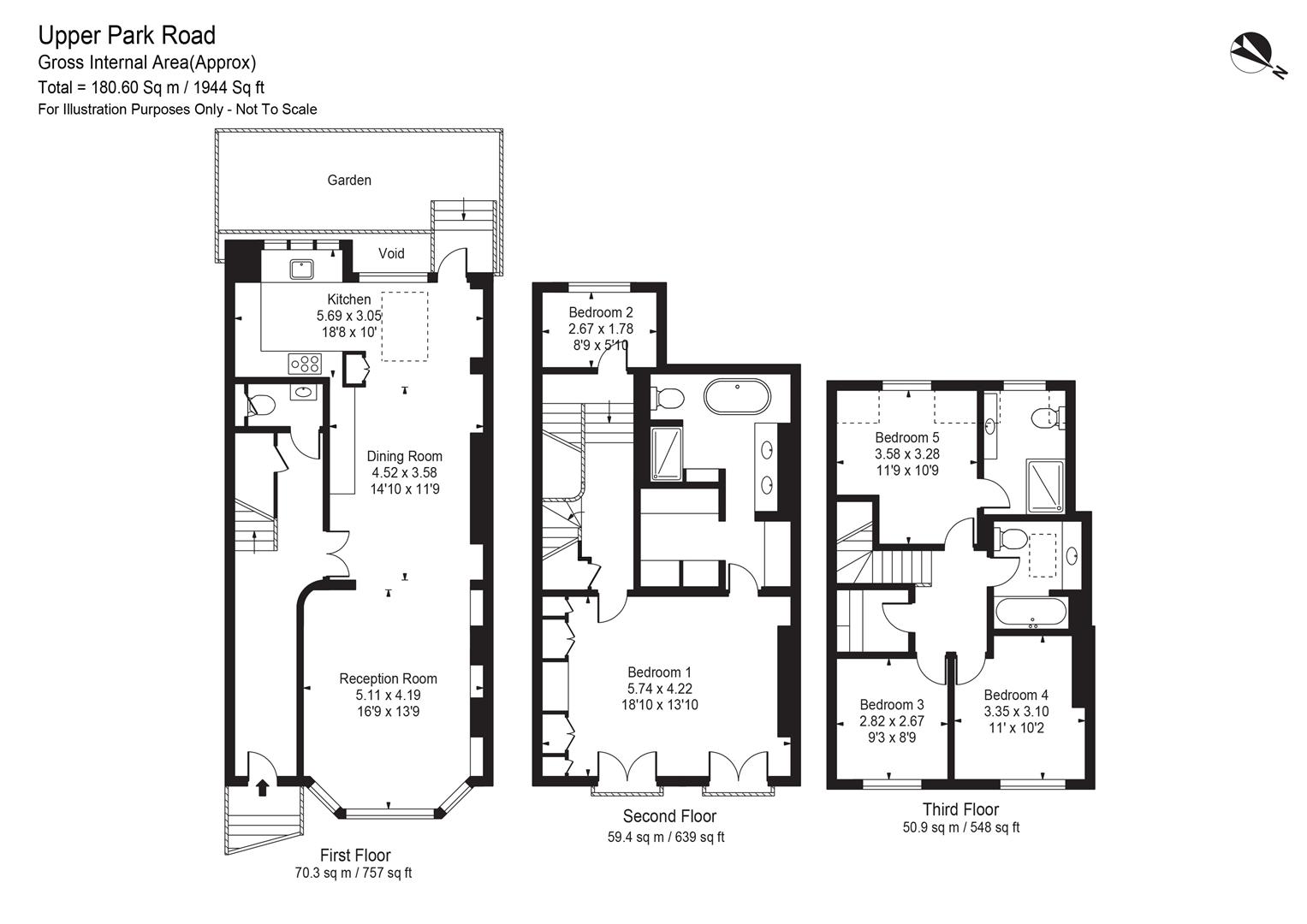 The master bedroom suite is situated on the second floor with an en-suite shower room and dressing room. Additionally, there are a further four bedrooms and two bathrooms on the upper two floors.